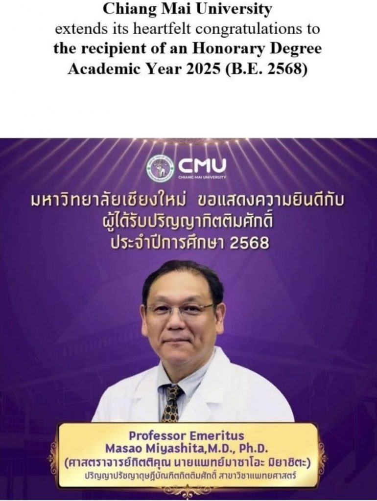 このたび、本学名誉教授の宮下 正夫 先生が、タイ王国チェンマイ大学(Chiang Mai University)より、名誉医学博士号(Honorary Doctoral Degree)を授与される旨の通知がありました。授与式は2026年1月21日に、チェンマイ大学にて行われる予定です。本表彰は、医学および学術分野における長年にわたる多大な貢献と、国際的な教育・研究活動が高く評価されたものです。本学としても、先生のこれまでのご功績に深く敬意を表するとともに、今回のご受賞を心よりお祝い申し上げます。